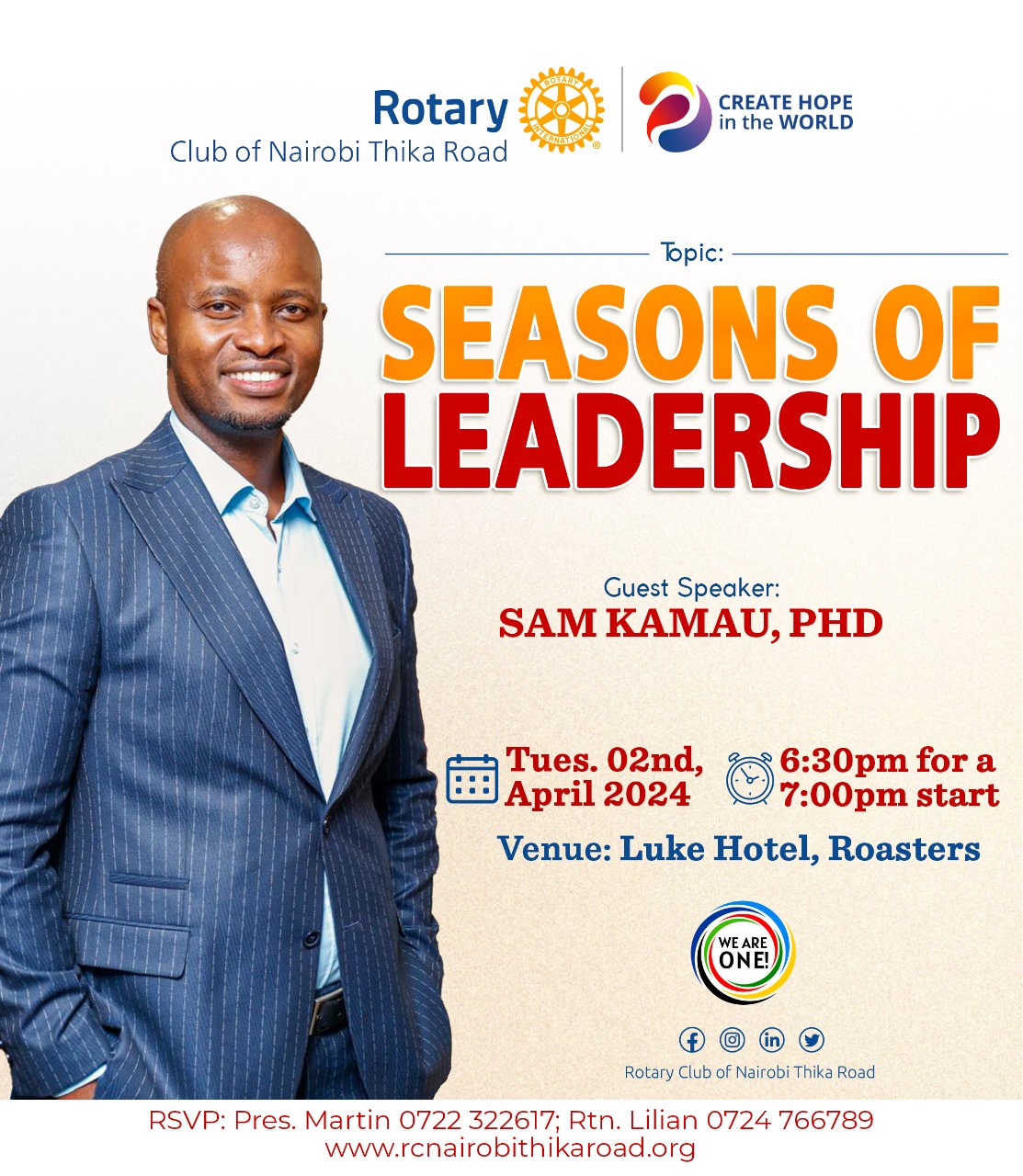 We welcome you to join us this Tuesday, the 2nd of April 2024 as we host Dr. Sam Kamau, a seasoned professional and gifted Public Speaker delves deep on this thought provoking topic on ” Seasons of Leadership”